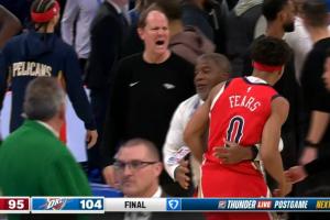 鹈鹕雷霆比赛结束爆发剧烈冲突 多特费尔斯掐架 费尔斯被一路拦回