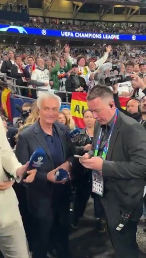 虽然你赢了我的主队!穆帅场边采访 一旁皇马球迷高唱穆里尼奥之歌