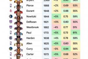 詹姆斯关键时刻总得分2865分断档历史最多 胜率62%也是最高