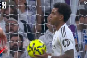 皇马获点后罗德里戈一直在点球点抱着球,最后姆巴佩上前接过皮球