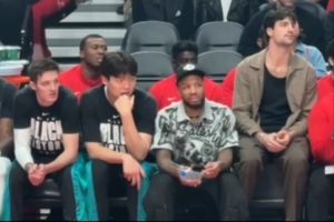 静静等待机会!小吧拍到杨瀚森坐在利拉德旁 认真观察场上局势