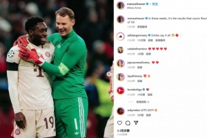 体育资讯2月19日讯 拜仁在本轮欧冠主场1-1绝平凯尔特人,门将诺伊尔在赛后通过社媒庆祝晋级。