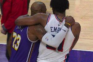 胜负已定之时 詹姆斯拥抱恩比德 两人有说有笑