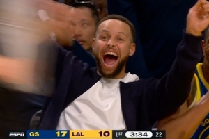 偷我技能包?小佩顿底角撤步三分一箭穿心 库里兴奋手舞足蹈