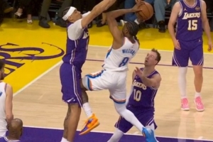 看着都疼!杰伦威踢到海斯要害被吹进攻犯规 雷霆挑战失败