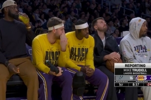 三核悠哉观战!老詹喝饮料 东契奇抱球看大屏 里夫斯坐第二排