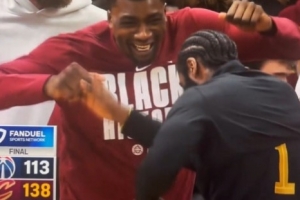 氛围真棒!拖布赛后拉着哈登疯狂舞动庆祝 给登哥都整害羞了~