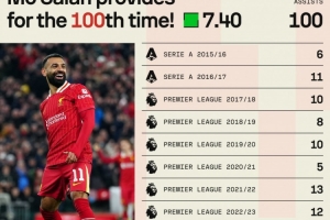 此外,在近10个赛季中,萨拉赫在联赛中的助攻总数已经达到了100次,他是五大联赛中第四位做到这一点的球员。此前三位分别是德布劳内(117助攻)、穆勒(116助攻)和梅西(110助攻)。