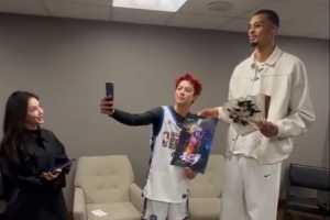 最萌身高差!王鹤棣名人赛前与文班亚马自拍合影 美娜在一旁观看