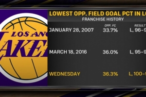 2016年3月18日,湖人90-95不敌太阳,太阳命中率为36.0%。