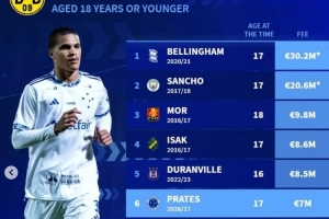 多特U18最贵引援榜:贝林厄姆压桑乔居首,伊萨克、普拉特斯在列