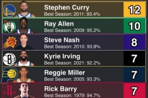 罚球命中率90+%赛季次数:库里12次历史最多 雷·阿伦10次