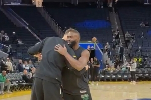 老队友!波尔津吉斯赛前热身 杰伦·布朗&怀特上来与其互动