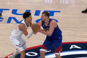 没得逞!约基奇中线面对防守直接大回环要罚球 裁判给了提前犯规