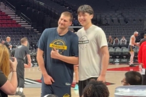 梦想成真~杨瀚森赛前和约基奇聊天拥抱合影 说好的亲一下呢🤣