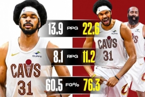搭档哈登时阿伦22.6分11.2板&命中率76.3% 反之13.9分8.1板&60.5%