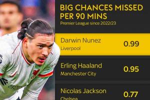 据天空体育统计,在2022/23赛季努涅斯加盟利物浦之后,他在英超场均错失重大机会0.99次在所有球员中排名第一,而在此期间努涅斯在英超的数据为86场39球。
