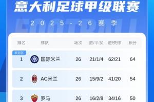 意甲积分榜:罗马升至第三与那不勒斯同分,米兰遭遇近25轮首败