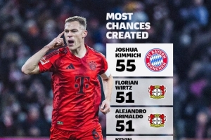 体育资讯2月21日讯 德甲官方统计了本赛季球员创造机会的次数,并列出榜单,基米希55次居首,维尔茨、格里马尔多51次第二。