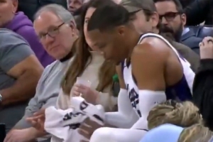有点危险的!威少冲出界外 踩爆了场边的啤酒瓶&酒花飞溅😅