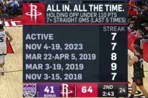防守稳步提升!火箭连续8场将对手得分限制在110分以下