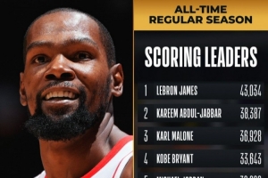 里程碑!杜兰特砍下个人生涯第32000分 继续排名历史得分榜第6