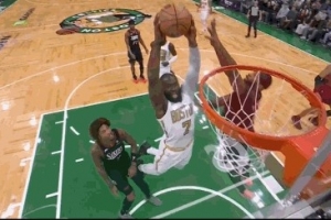 如入无人之境!杰伦·布朗杀入篮下双手暴扣 扣完单臂挂筐耍帅