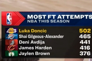 东契奇本赛季罚球超500个联盟首人 亚历山大465个排第二&哈登第四