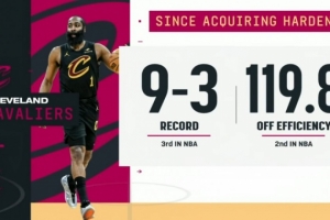哈登加盟以来骑士战绩9-3期间联盟第三 进攻效率119.8联盟第二!