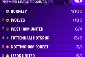体育资讯3月6日讯 英超第29轮比赛,热刺主场1-3不敌水晶宫。Squawka列出了本赛季英超球队降级赔率排名,伯恩利居首,热刺第四。