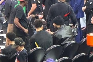 行动如常!狄龙随球队一起出席今日对阵鹈鹕比赛 便装坐在板凳席