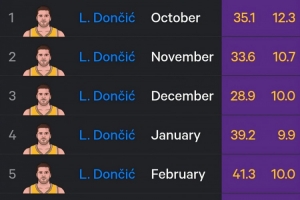 东契奇本季各月三分命中率:12月仅28.9% 近三个月稳定在40%