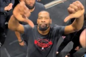 杜兰特与球迷互倒竖大拇指 嬉戏打闹