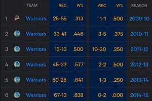 库里生涯各赛季出战与否勇士战绩&胜率:本赛季缺席时 胜率降23%