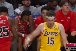 谁也不让谁!杰伦·史密斯抢篮板和里夫斯纠缠在一起 双方争球