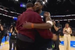跟大哥打个招呼!爱德华兹赛后找到库里拥抱致意