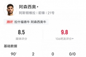 体育资讯2月23日讯 英超第26轮,维拉2-1切尔西。阿森西奥首发出战,贡献双响,还送出2次关键传球,评分8.5全场最高。