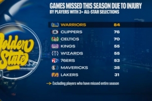 本赛季至少入选3次全明星球员因伤缺阵场次:勇士84场全联盟最多