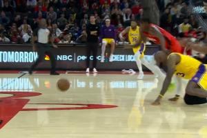 难受……东契奇丢球 老詹刹车没刹住倒地了 火箭笑纳快攻扣篮