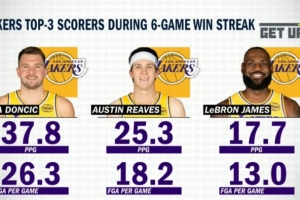 一目了然!东契奇6连胜场均爆轰37.8分 小里25.3分 詹姆斯17.7分