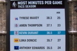 本季场均出场时间榜:37岁杜兰特第3 东契奇第4 前五仅老杜过30岁