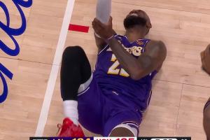 燃尽了!詹姆斯先连续防守又全力冲刺上篮被犯规 手肘再次受伤!