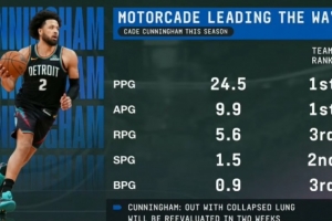 不可或缺!坎宁安本赛季场均得分助攻队内第一 板断帽均列前三