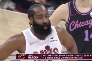 哈登本赛季50次造成三分球犯规领跑全联盟 加入骑士之后已经9次