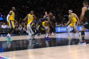 拼得很凶!阿德巴约抢球直接骑到东契奇身上 两人均有些不适
