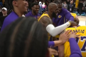 等你再建紫金王朝!赛后全队围着东契奇激情庆祝