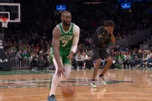 够吓人的!杰伦·布朗反击冲筐对抗里德平拍倒地 好在无碍