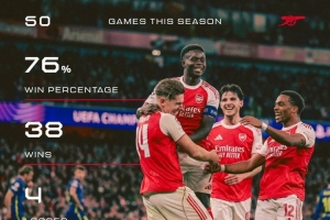 阿森纳社媒晒本赛季50场比赛战绩:38胜8平4负,胜率高达76%