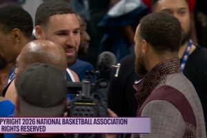 昔日王朝三人组!侠勇赛后 克莱与库里、追梦寒暄数句