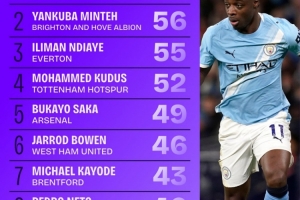 体育资讯3月24日讯 数据机构Squawka统计出了本赛季英超球员过人数情况,曼城边锋多库以63次居首。
